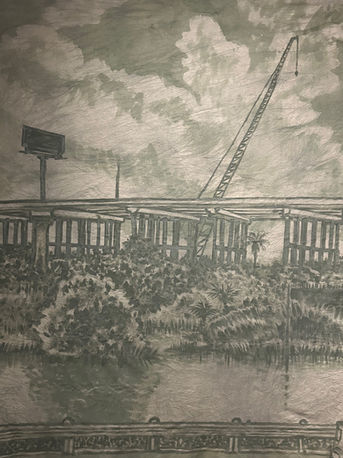 Causeway, the offshore oil platform, Perdido, a stretch of HWY-146, and a concrete rubble