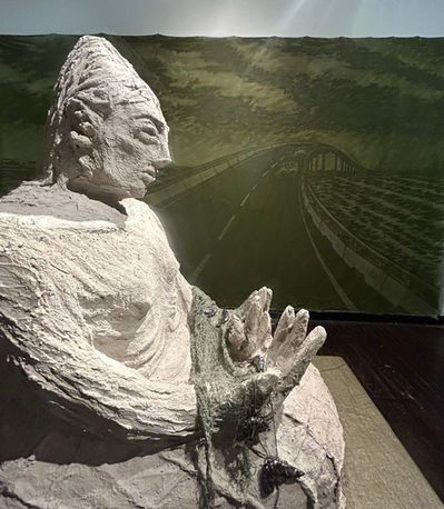 agitation and disruption of our ecological balance writ large. The theatrical-style backdrop