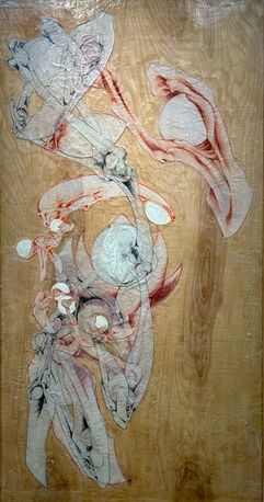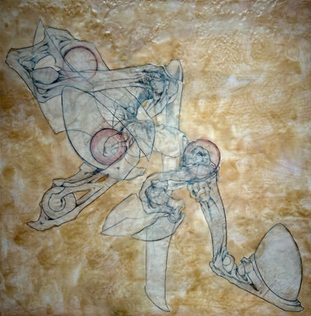 Palimpsest is process, in my art and in art history. For the ancient Greeks it meant writing on wax tablets, then heating the wax to erase the words before writing something else, with traces of old texts at times visible beneath the new layers. In my artistic practice drawings are layered like sediments in a river delta, images coming to rest one atop another, some rising to the surface, some buried. Forms drawn in graphite or Conté crayon on a sheet of drafting vellum come about organically, spontaneous marks giving rise to images without a predetermined idea of the ultimate outcome. One page is filled, set aside, and a new one is started. Over time (months, even years) a stack of drawn forms accumulates, and these are spread on the ground, the transparency of the paper allowing one to be seen through another, creating unanticipated correspondences and relationships. Bathed in beeswax on a panel of birch they are bound together and enlivened.