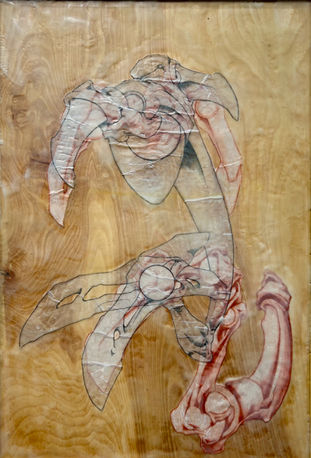 Though imagery and form are not predetermined, things that resemble bits of the natural world – bones and beaks, tendons and claws, to my eye – work their way onto the page. Anatomical structures, the necessary scaffolding on which bodies are built, assert themselves. They are neither literal nor intentional, but it would be dishonest to deny them. My interest is in movement, the wind that bends the branch and shapes the tree, not the wood. Mondrian painted the same tree again and again and again, obliterating all that might be recognized as “tree” in search of something ineffable. I see myself seeking something similar, but I suppose I still need the pieces, which over time have become more detailed and referential in my drawings. What interests me when I step back is not what they are, what thing they resemble, but what they are doing, verb rather than noun. Anatomy allows for animation: running, dancing, flying, rising through layers of vellum and wax.