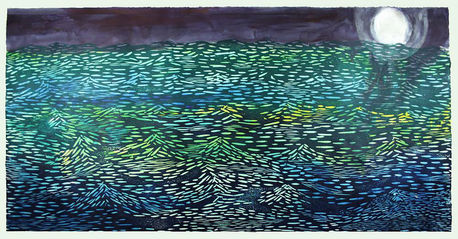 Tidemark is a comprehensive body of Sabra Booth’s work spanning over two decades, reflecting on North America’s coasts. Like a 19th century naturalist, Booth often sketches and paint flora and fauna on site. She uses these drawings as touchstones for her studio work. Design considerations are evident through the implementation of graphic line, negative space, actual texture, and limited color. Booth typically creates an interplay between the gestural fluidity of water media and the structural line work of drawing or printmaking processes. Since her graduate thesis show, she has explored the play of light and shadow, incorporating translucent cut-paper.